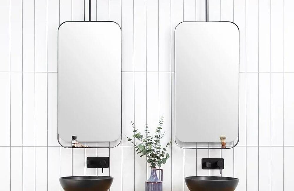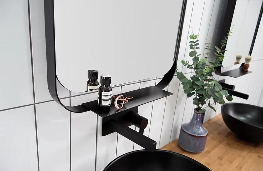 Matte Black metal frame surround and shelf. Option of fixed, close to wall bracket, or swivel bracket. Mirror is copper free