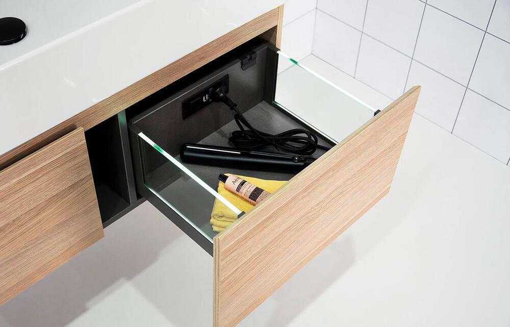 Shown in Classic Oak Nuance textured cabinet finish. Scarabeo Teorema 2.0 Italian ceramic top. Available in 0 or 1 tap hole