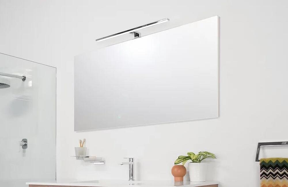 Mirror mounted on 16mm black or white satin board. Overhead Daylight included. Shown in chrome. Can be installed vertically or horizontally. Mirror is copper free
