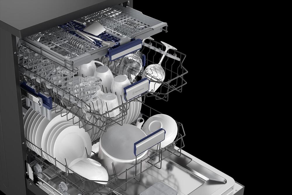 60cm freestanding dishwasher, dark stainless steel, with 15 place settings, AutoDoor, 8 wash programs including SensorWash programs, FastDry system, FlexTray cutlery tray, height adjustable baskets when fully loaded and 45dB operation.