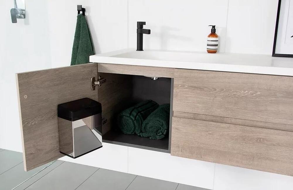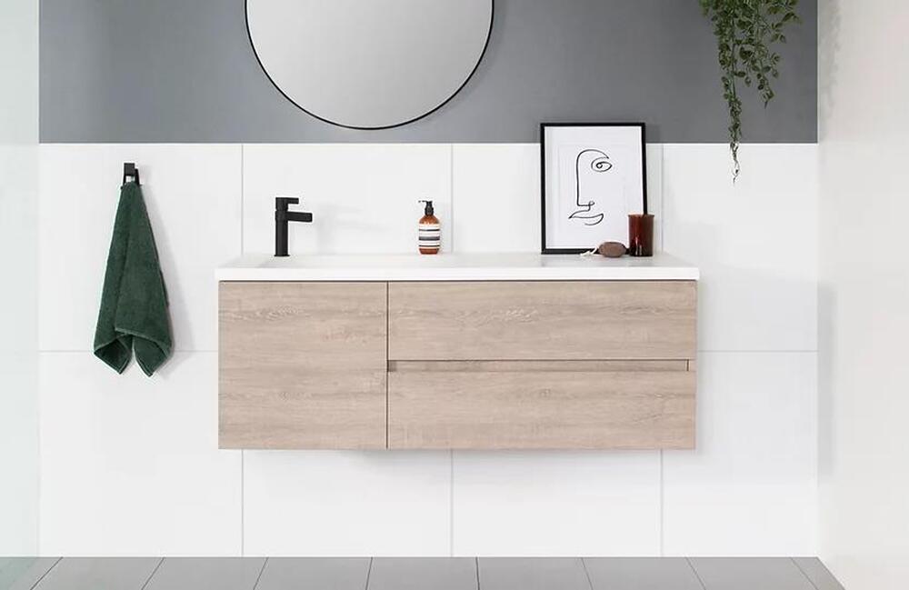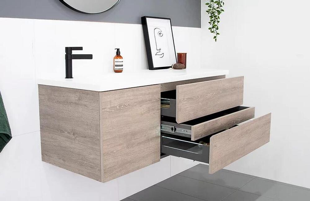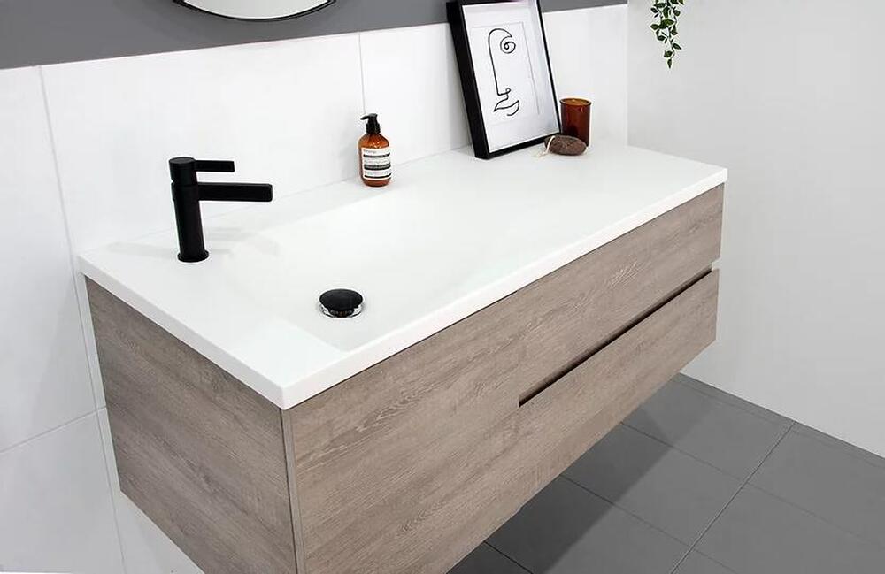 Shown in Delana Oak Chalk textured cabinet finish. Solid surface benchtop in Matte White.1 Tap Hole only