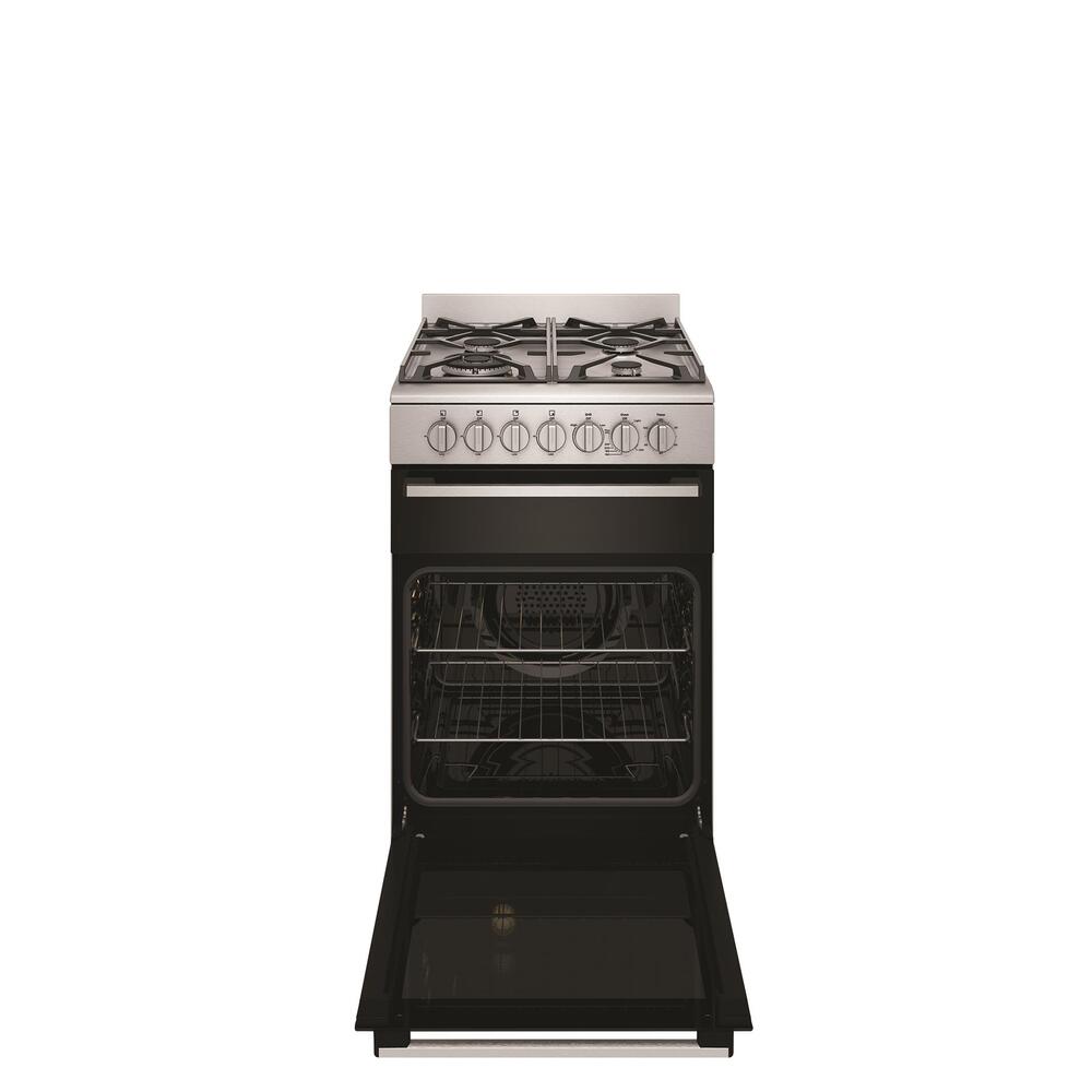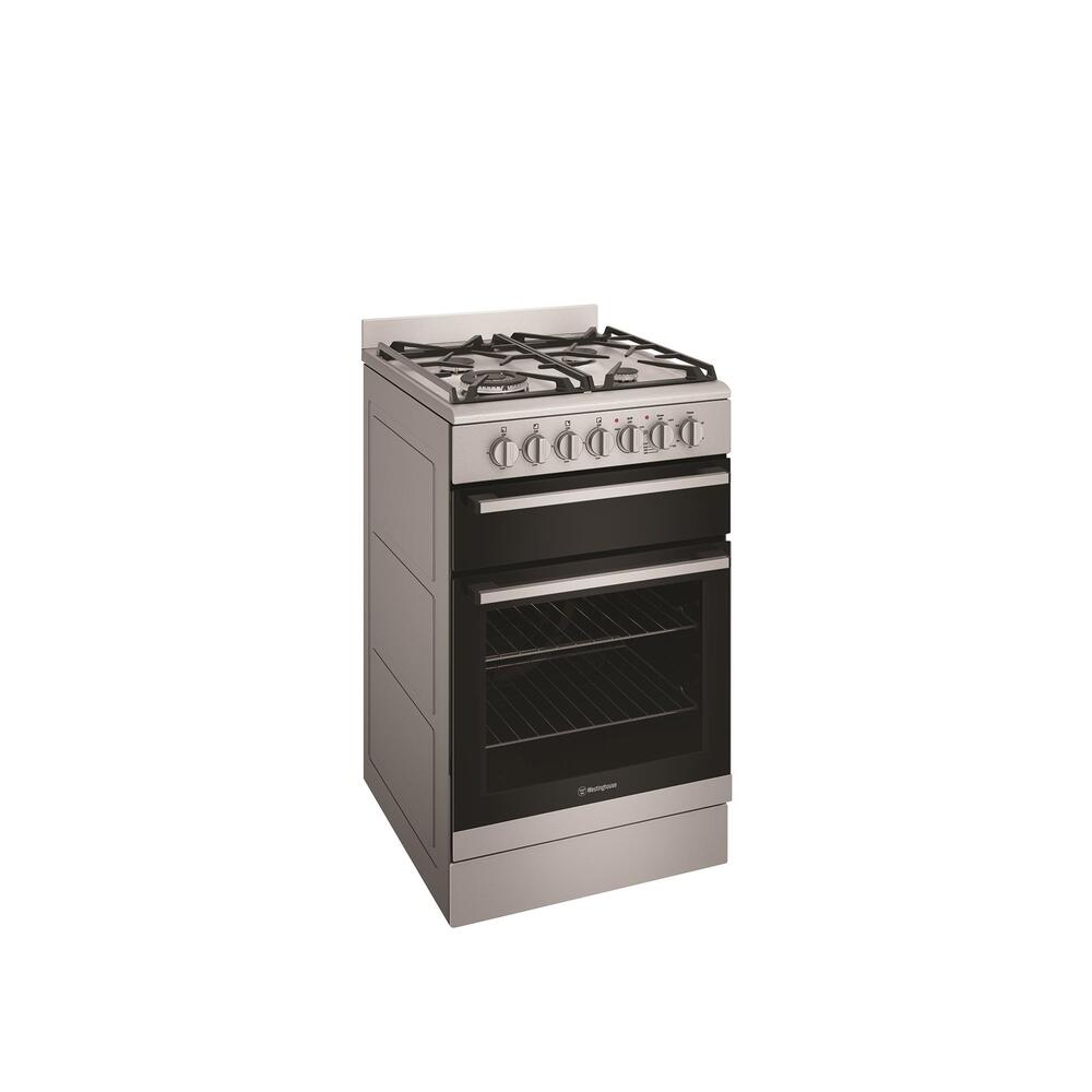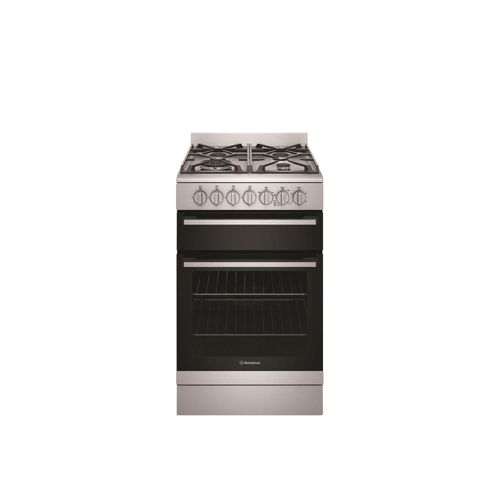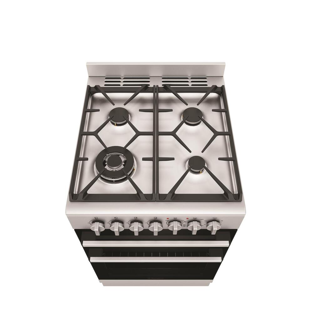 54cm stainless steel dual fuel freestanding cooker with separate electric grill, fan forced electric oven, 120 minute timer with ringer, 4 burner gas cooktop with 14.2 mj/hr wok burner and cast iron trivets