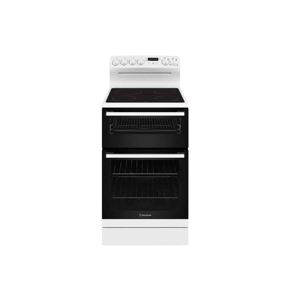 54cm white electric freestanding cooker with separate electric grill, fan forced electric oven, digital programmable timer and a 4 zone ceramic cooktop.