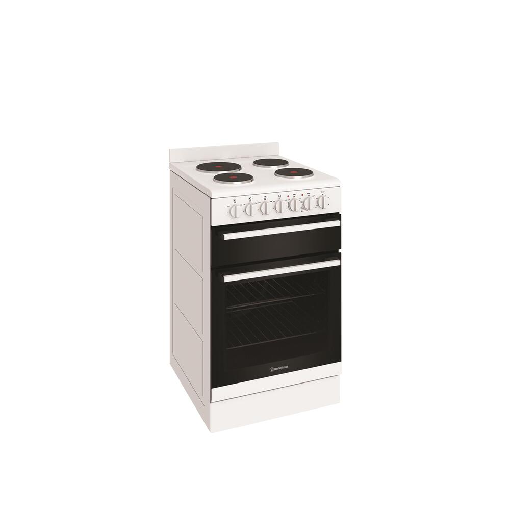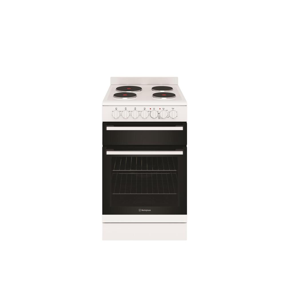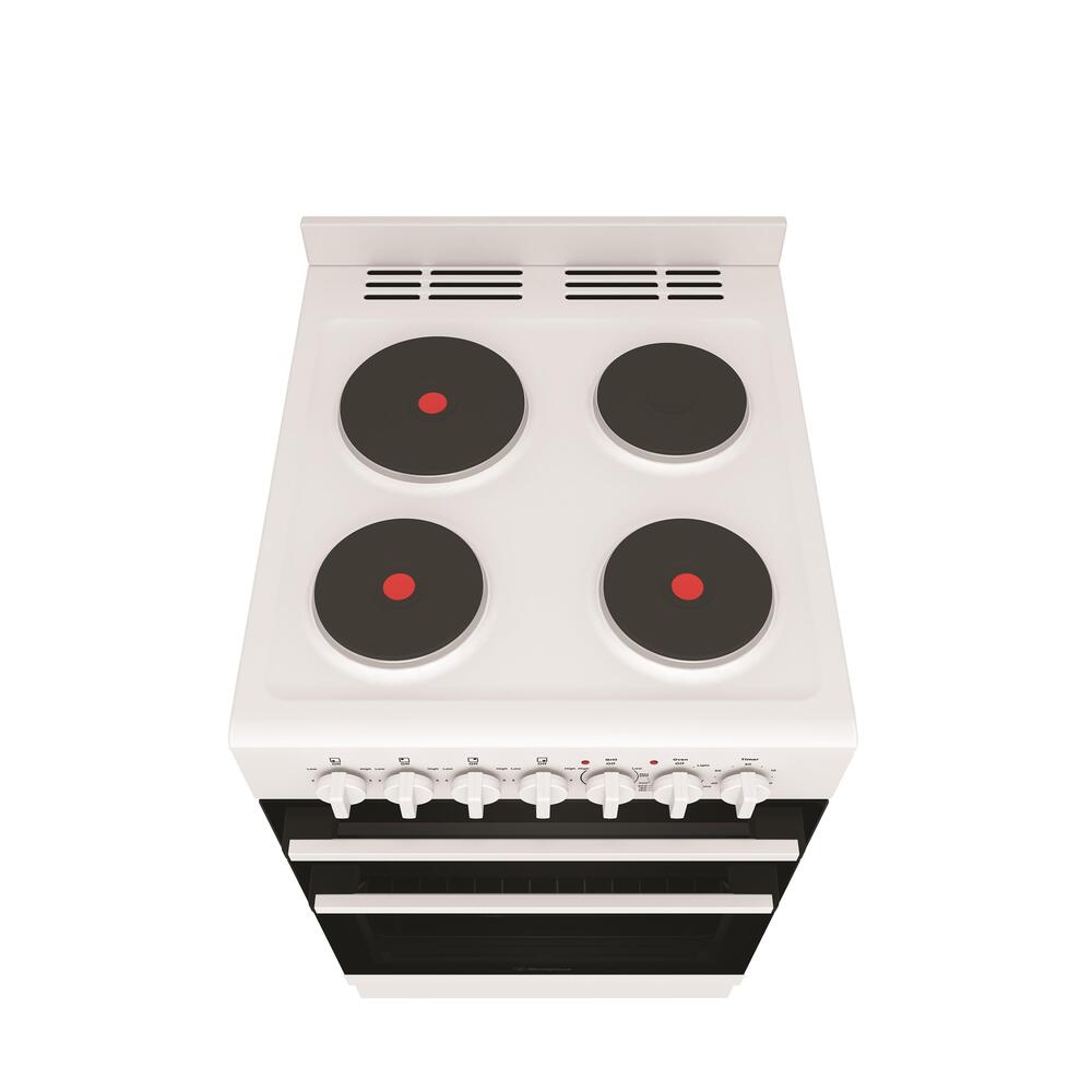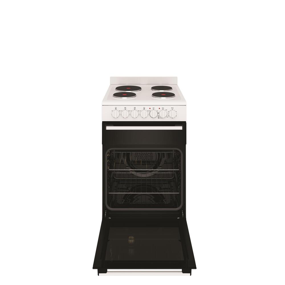 54cm white electric freestanding cooker with separate electric grill, fan forced electric oven, 60 minute timer and a 4 zone solid cooktop.