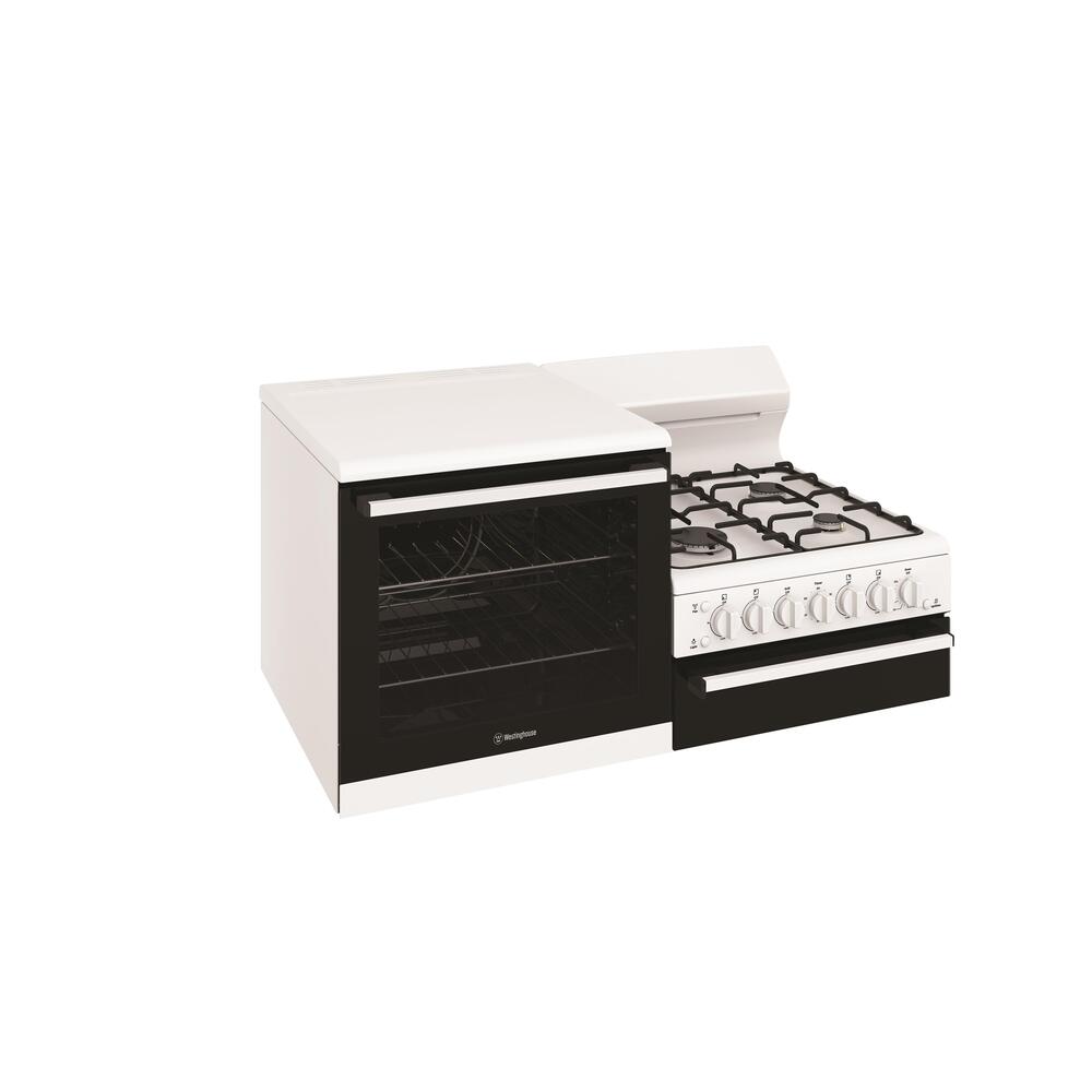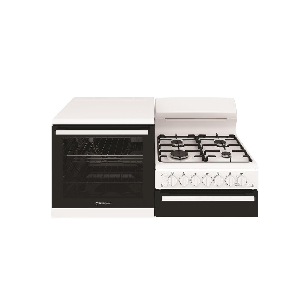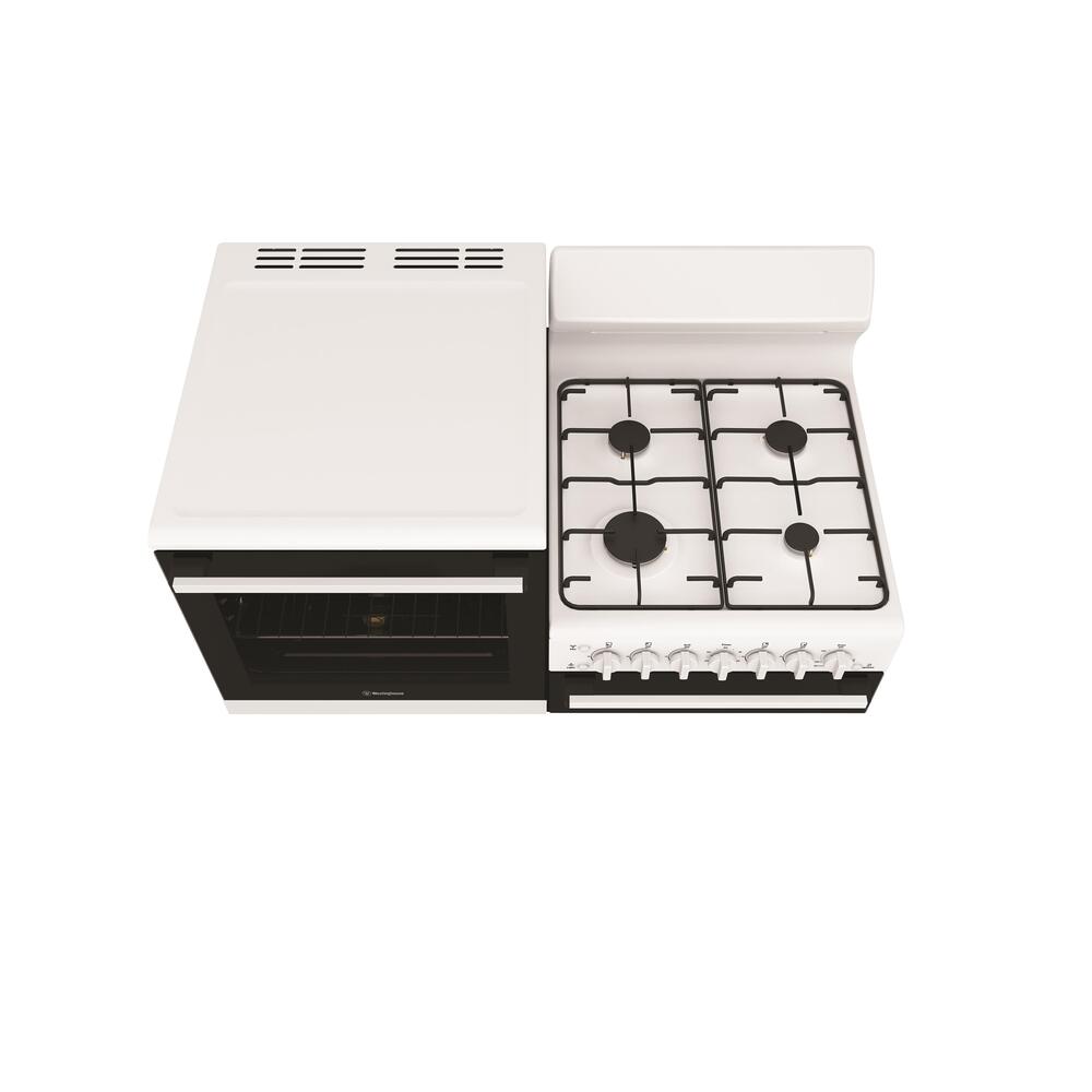 White elevated gas freestanding cooker with separate gas grill, conventional gas oven with fan, 60 minute timer and 4 burner gas cooktop with electronic ignition.