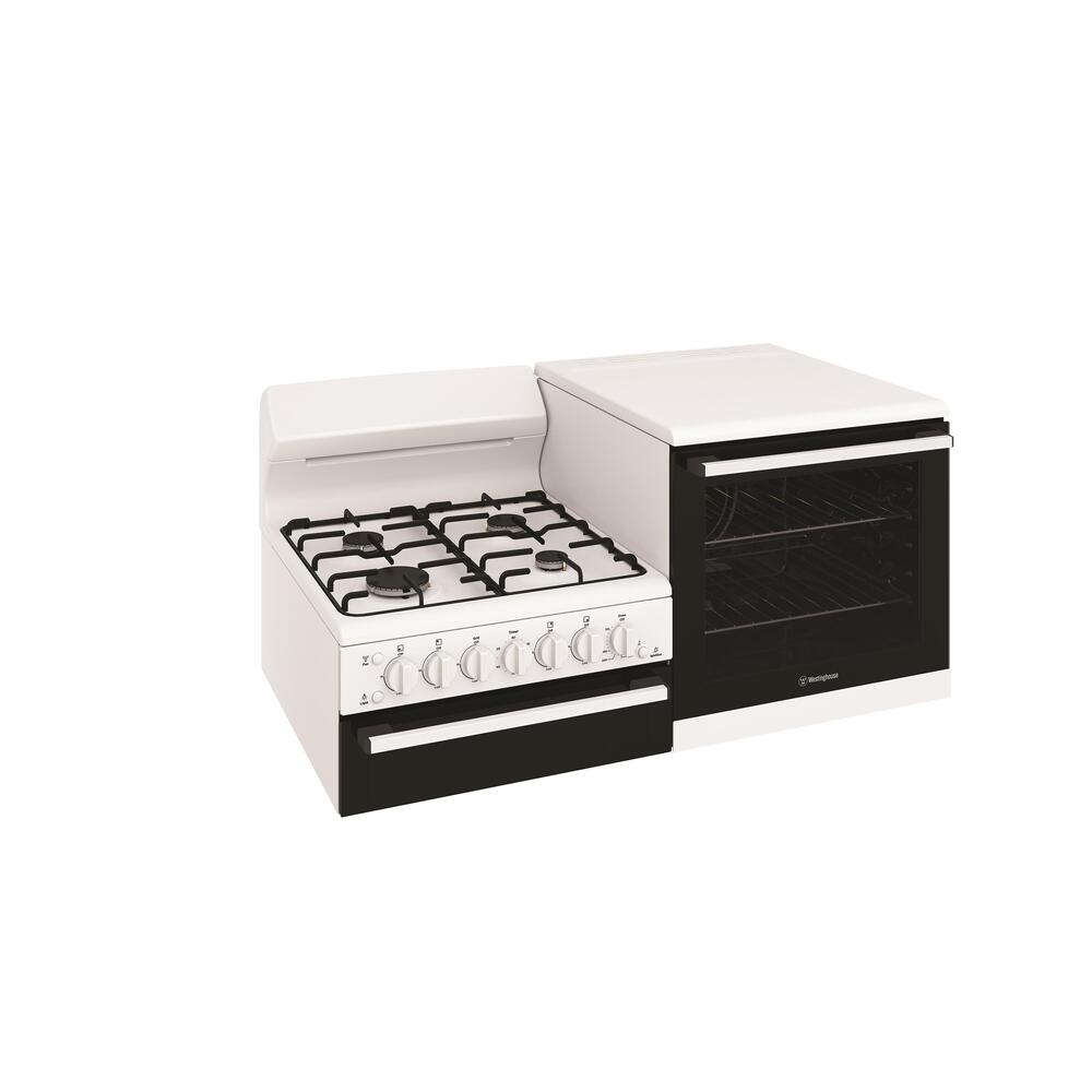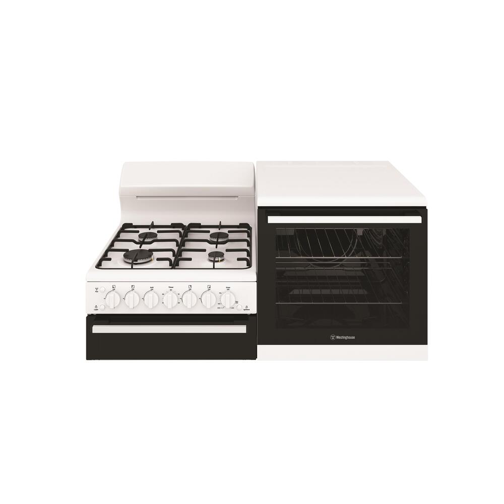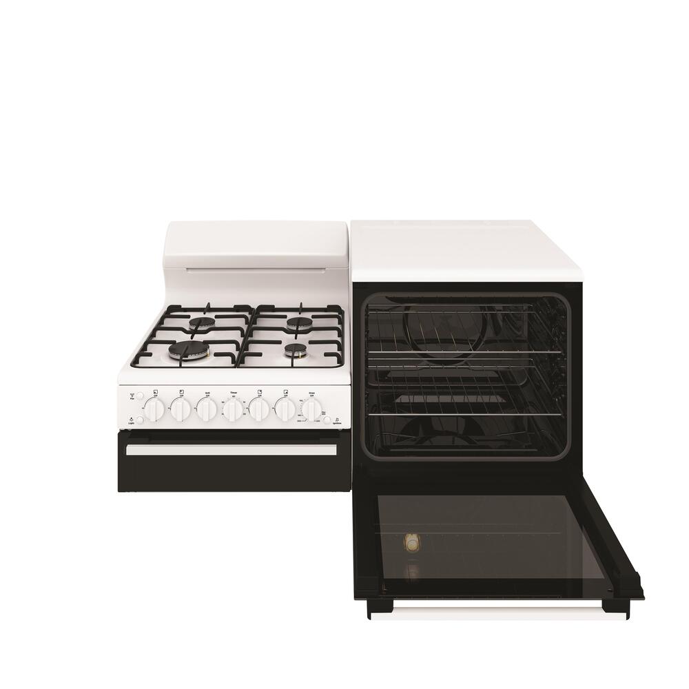 White elevated gas freestanding cooker with separate gas grill, conventional gas oven with fan, 60 minute timer and 4 burner gas cooktop with electronic ignition.