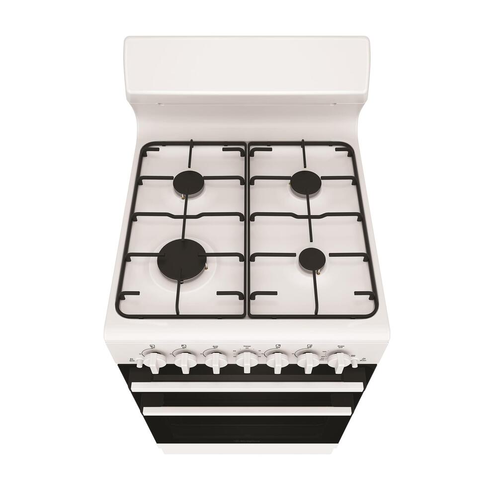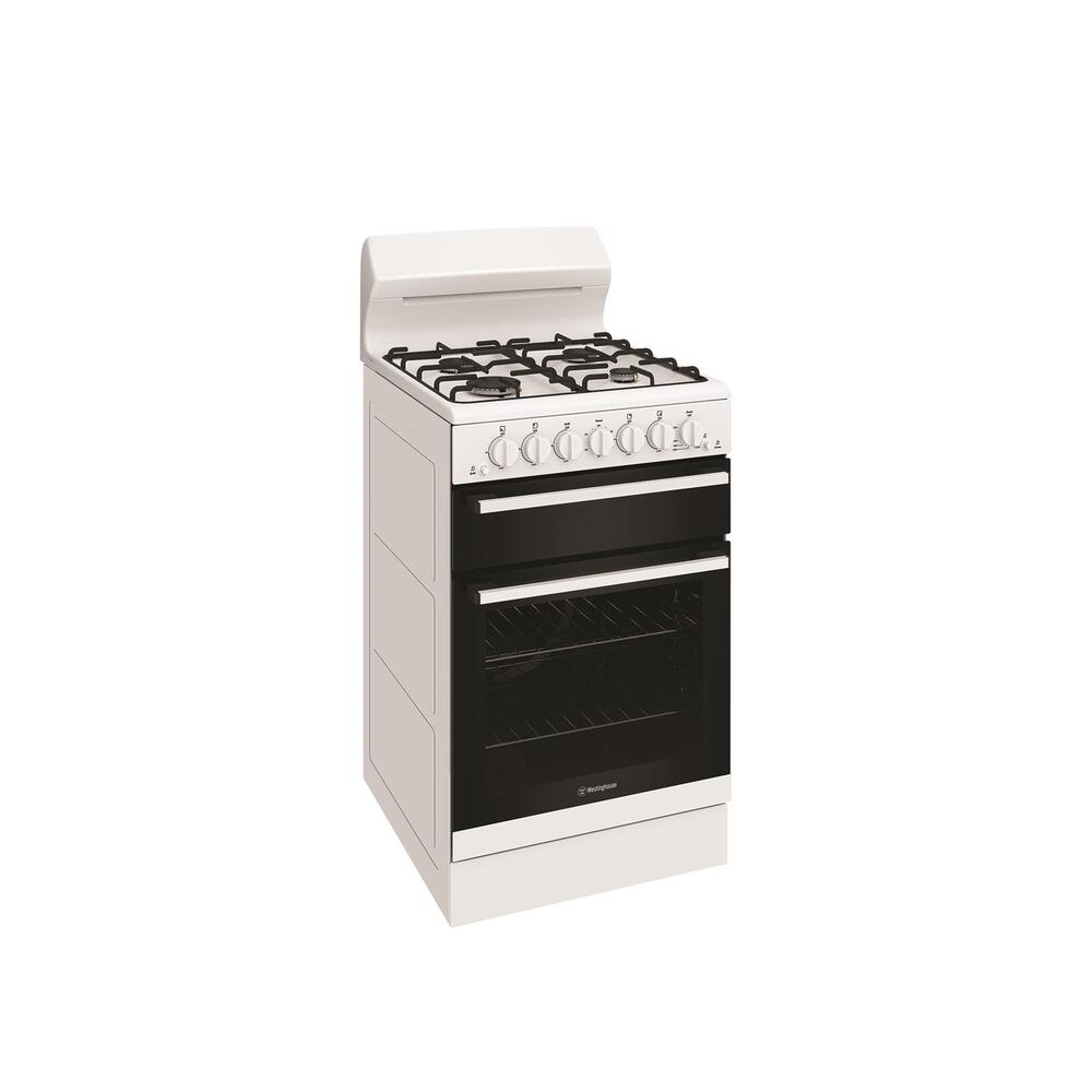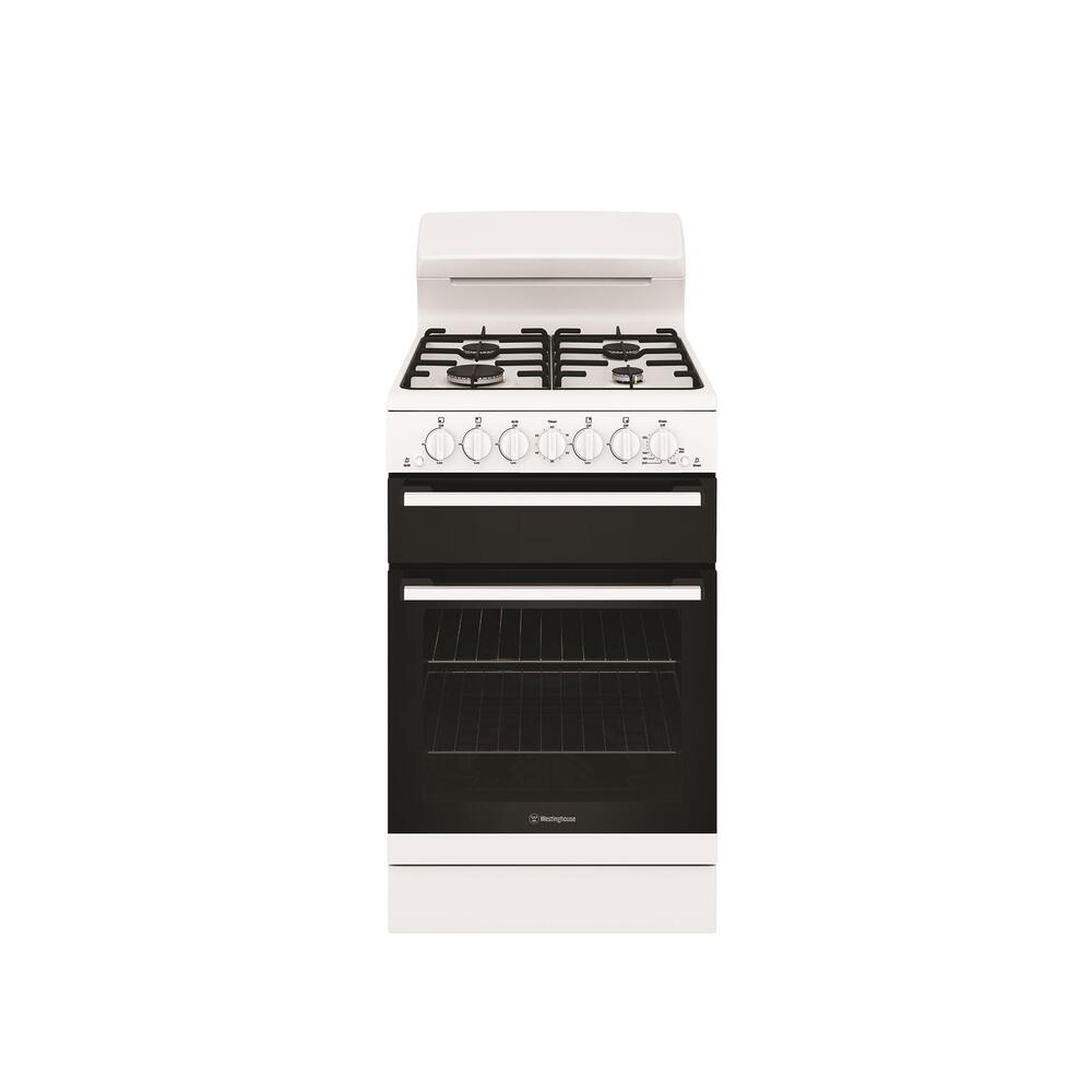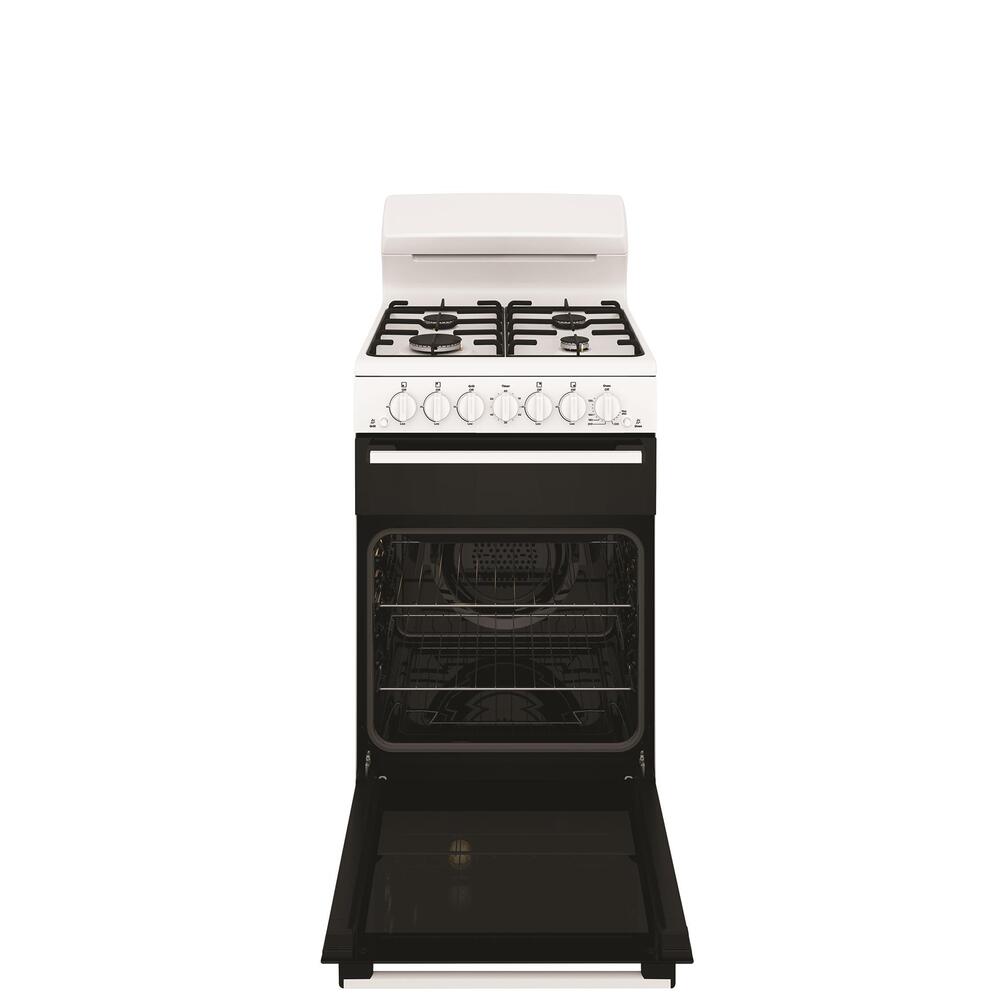 54cm white gas freestanding cooker with separate gas grill, conventional gas oven, electronic ignition, 60 minute timer and 4 burner gas cooktop. COMMERCIAL EXCLUSIVE.