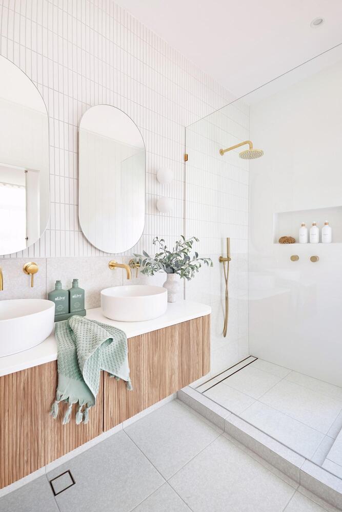 Shown in Ultra White mattecabinet finish, Concrete Mist Cherry Pie benchtop, Respect semi inet basins sold separtely.